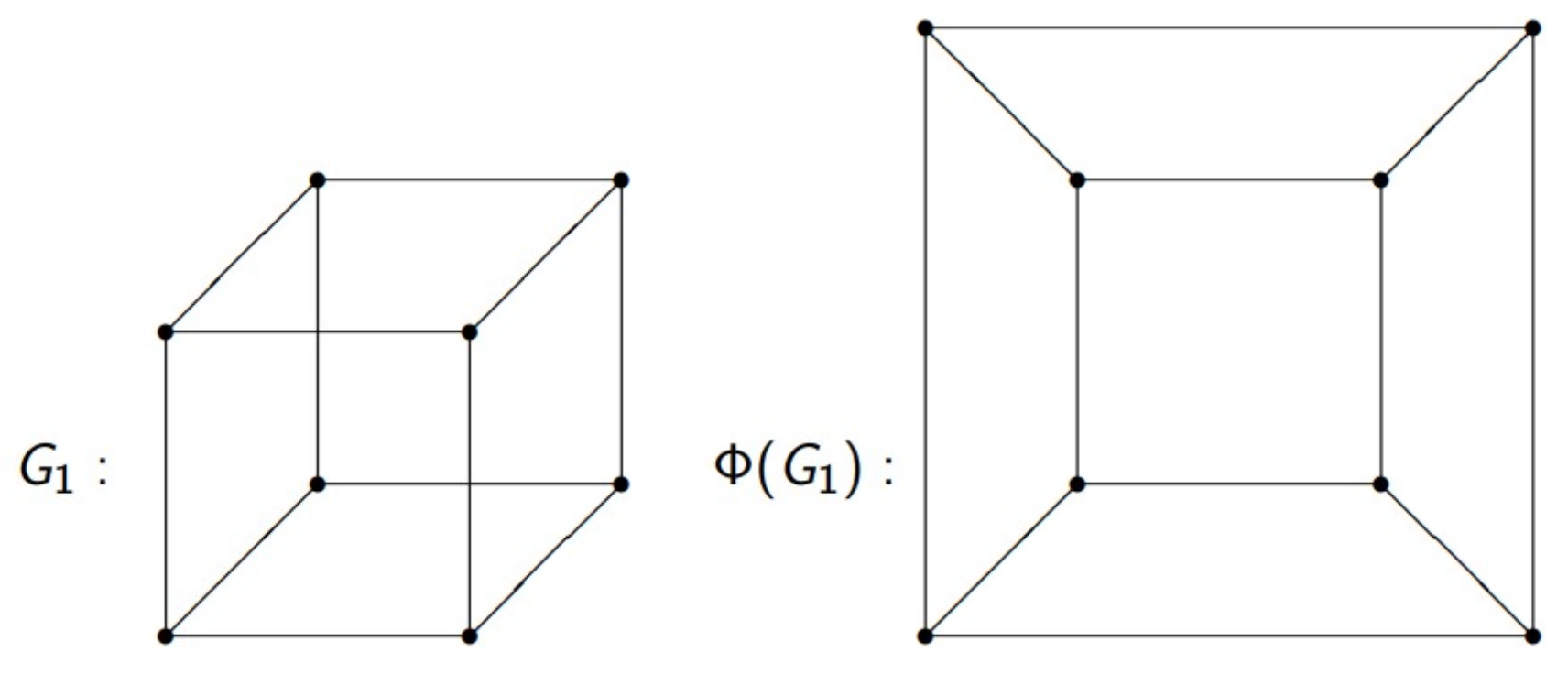- \(G_2\): A cube with an extra diagonal edge and a curved edge connecting opposite corners