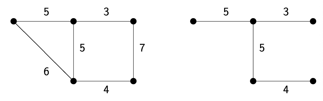 Problem: Given a connected edge-weighted graph \(G\), find a spanning tree \(T\) with minimal total weight.